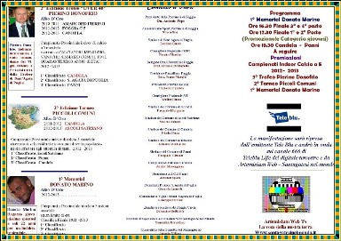 Chiusura dunque di tutti i campionati indoor di calcio a 5 per quanto riguarda l’attività sportiva 2012 – 2013 nello splendido palazzetto dello sport di Sant’Agata di Puglia, autentico gioiello per le realtà impiantistiche dei nostri territori. Infatti Sabato 20 Aprile 2013 alle ore 18.00, gran galà di premiazioni, con ancora in programma due finali da disputare che completeranno il ciclo di manifestazioni sportive del calcio a 5 indoor. Il progetto nato da un’idea del dott. Giuseppe Macchiarola, allora Presidente del Coni Provinciale e dalla stella al merito sportivo Donato Magnisio, tenace organizzatore e tra i massimi esperti del calcio dilettantistico, fu subito sposata dall’Amministrazione Comunale di Sant’Agata di Puglia e si decise dunque di valorizzare lo sport nel nostro territorio e nel palazzetto di Sant’Agata di Puglia con campionati che potessero sviluppare al meglio questa disciplina nei nostri piccoli comuni. Quell’idea oggi è diventata la più importante manifestazione di calcio a 5 del nostro territorio. Nel 2010 si cominciò in punta di piedi organizzando per la prima volta il campionato dei Piccoli Comuni, ovvero torneo riservato ai soli Comuni al di sotto degli ottomila abitanti, e con atleti che per partecipare dovevano avere la residenza nel paese di appartenenza. Questo campionato dava l’opportunità ai ragazzi dei piccoli paesi di misurarsi e giocare con i propri coetanei con i colori del proprio paese. Nel 2011 si pensò di abbracciare una più vasta rappresentativa di atleti e nacque il Trofeo Pierino Donofrio dapprima senza limiti di età, e oggi diventato con risultati inimmaginabili un campionato riservato agli over 40, con la presenza di calciatori vecchie glorie dei tanti campi di calcio nostrano, dove bisogna segnalare la partecipazione anche del GS Baronia, formazione proveniente dalla provincia di Avellino. E poi nasce ancora il primo Memorial Donato Marino, dal il nome di un ragazzo di 21 anni venuto a mancare prematuramente per un incidente stradale. Anche questo campionato ha riscosso incredibile successo. Questo ed altro nei campionati indoor è stato possibile grazie all’apporto determinante di Rino Fenuta e Daniele Magnisio responsabili dei settori calcio e arbitrale dell’Asi, con il contributo dell’assessore allo sport del Provincia di Foggia Rocco Ruo, con il patrocinio del Coni, della Provincia e del Comune di Sant’Agata di Puglia. Un plauso va anche ad altri collaboratori da Franco Cancellaro, a Claudio Quaglione, Lorenza Nigro, Gianluca Fenuta , Fiorella Fiscarelli, Carlo Fusilli e Gino Magnisio. Validissimo anche l’apporto di Artemisium Web – Santagatesi nel mondo e Tele Blu, che con la massima puntualità hanno trasmesso tutti gli incontri dando lustro alle manifestazioni. Un grazie ai sindaci dei piccoli paesi, Accadia, Ascoli Satriano, Candela, Castelluccio Valmaggiore, Deliceto, Panni, Sant’Agata di Puglia. E poi tanti amici e formazioni giunte da tutte le parti del nostro territorio, dal capoluogo Foggia Mia, La Magica, gli Amici del pallone, poi Murotorto Lucera, Baronia, Sporting Team, Dogo Club, Regno delle due Sicilie ecc. ecc. Tra le note positive da sottolineare la grande correttezza delle squadre partecipanti condite da tanta gesti di fair play degli atleti partecipanti. Questi i risultati dei campionati già terminati: