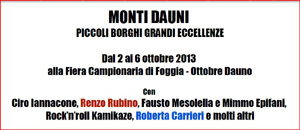 Si terrà dal 2 al 6 ottobre 2013 presso la Fiera Campionaria di Foggia durante l’Ottobre Dauno”, un nuovo salone fieristico denominato “Monti Dauni - Piccoli Borghi Grandi Eccellenze”, uno spazio dove il pubblico potrà conoscere e respirare l’effervescenza culturale di un territorio estremamente caratteristico: i Monti Dauni.