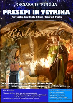 ORSARA DI PUGLIA (Fg) – Per il secondo anno consecutivo, da oggi e fino al 6 gennaio 2014, i negozi del centro storico orsarese ospiteranno “Presepi in vetrina”: ogni esercizio commerciale farà spazio a una diversa rappresentazione della natività realizzata con materiali e tecniche differenti. L’iniziativa, patrocinata dal Comune di Orsara e dalla Regione Puglia, è organizzata da un gruppo di volontari unitosi intorno alla Parrocchia di San Nicola di Bari, con il contributo fondamentale di alcuni sponsor privati che hanno deciso di sostenere anche materialmente l’idea. Quest’anno, il tema di “Presepi in vetrina” è “Gesù nasce fra gli ultimi”. I presepi saranno esposti lungo le strade principali del paese, andando a comporre un percorso che comprende via Umberto I, via Sergente Volpe, Piazza Municipio, via Cavour, via Vittorio Emanuele e Via Roma. Il cuore dell’itinerario dei presepi sarà Piazza Municipio, addobbata per l’occasione con un particolare arredo natalizio: materiali di riciclo, adeguatamente lavorati e trasformati, faranno dell’agorà che si estende di fronte alla Chiesa Madre il luogo più confortevole e ospitale del borgo. I presepi in mostra nelle vetrine potranno essere ammirati dalle ore 18 alle ore 21 per tutto il periodo delle festività natalizie, fino al 6 gennaio 2014. Oggi, sabato 7 dicembre, l’iniziativa sarà presentata alle 18.30 in Piazza Municipio. Dopo la presentazione, sarà possibile degustare i dolci e i piatti tipici della tradizione natalizia orsarese lungo il percorso enogastronomico che prevede tappe da Ego, Pane e Salute, Donna Cecilia, Pablo Neruda e la Locanda dell’Angelo. “Presepi in vetrina” è la prima di molte iniziative che animeranno le feste di Natale a Orsara di Puglia. Nel “paese dell’Orsa”, il presepe ha una tradizione antica e di grande rilievo, grazie alla peculiare abilità di numerosi artigiani che amano sperimentare l’utilizzo di tecniche e di materiali nella realizzazione delle loro opere. Il centro storico orsarese, poi, appare esso stesso come un presepe, con l’Abbazia Sancti Angeli che ospita una vera grotta, quella in cui si narra dell’apparizione di San Michele Arcangelo, patrono del paese. Imponente e soave, custode della fede cristiana ed esempio del genio dell’architettura sacra, l’Abbazia, oggi detta “dell’Annunziata”, è la prima storica costruzione che appare alla vista di chi raggiunge Orsara. Il complesso, immerso nel verde, comprende la Chiesa di San Pellegrino e la Chiesa dell’Annunziata. L’elemento più importante e suggestivo è costituito dalla Grotta di San Michele, chiesa scavata nella roccia presumibilmente nel 200 dopo Cristo. Il tempio di pietra sorge all’interno di un anfratto naturale. Si tratta di uno tra i luoghi di culto più importanti e antichi del Mezzogiorno d’Italia. All’interno si trovano iscrizioni latine e i graffiti lasciati dai pellegrini.