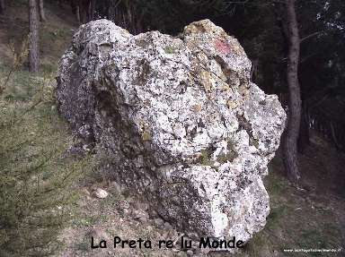 La Pietra del monte è un grosso macigno di forma allungata, rotondeggiante che emerge,solitario,sul fianco sud-ovest del monte detto della Croce ( Mònde re la Cròce ) a circa due terzi della base. Prima del rigoglioso rimboschimento, quando il monte era completamente brullo e pieno di erbacce, la pietra era meta dei giochi dei ragazzi che avevano modo di arrampicarsi sulla sommità, facilitati dalle molte piccole cavità che il macigno presentava sui fianchi. Disposto con l’asse maggiore da monte a valle,la pietra è lunga poco meno di tre metri, larga circa m.1,80 e alta in media, m. 1,90. Nel 1980 l’amico Vincenzo Russo, fratello dell’Assessore Provinciale Avv. Leonardo , appassionato di mineralogia, avendo notato sul macigno delle incrostazioni di fossili marini, riuscì a staccare un consistente frammento allo scopo di farlo esaminare scientificamente per conoscere la natura dei fossili e la loro età. E’ noto che nella sabbia estratta dalle vecchie cave del minte, dette <re cchève la réne >, un tempo necessaria ai muratori per la confezione delle malte, spesso si rinvenivano delle piccole conchiglie fossili. E poiché tutto il monte è composto in parte di argilla ( base sud-sud –est ) e in gran parte di sabbia di mare con stratificazioni di arenaria, è facile dedurre che tutta la zona era un tempo sommersa dal mare o che, probabilmente l’attuale monte, culminante con due piccole cime tondeggianti, sia emerso dal mare. Esso risale al penultimo periodo dell’età terziaria o cenozoica,cioè al miocene.