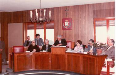 Sant'Agata di Puglia, Sala consiliare, 8 aprile 1983. Da destra: Gino Marchitelli, Pasquale di Cicco (direttore Archivio di Stato di Foggia), Dora Donofrio, Giovanni Russo (sindaco), Enzo Contillo, p. Bernardino Fondaco.