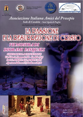 In una suggestiva sequenza di scene raffiguranti la Passione di Cristo, la mostra ‘’ La passione e la resurrezione di Cristo nei Presepi di Pasqua” si svolge a Candela(FG) presso la chiesa della Concezione in via Vittorio Emanuele III, organizzata dall’Associazione Italiana Amici del Presepio sede di Candela – Sant’Agata di Puglia che nel corso degli anni ha realizzato i diorami in esposizione. Un diorama è una rappresentazione, in questo caso di avvenimenti sacri, fatto in maniera prospettica, chiuso e visibile attraverso una sola apertura, chiamata boccascena. L’insieme dei diorami esposti nella mostra propongono al visitatore, attraverso delle immagini un suggestivo percorso. Gli “scenari” più significativi sono tratti dall’affascinante e coinvolgente evento della Passione di Cristo.
