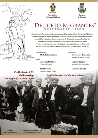 L’Associazione Turistica Pro Loco “A: Iossa” di Deliceto in collaborazione con il Comune di Deliceto hanno organizzato per sabato 3 maggio 2014, presso la sala "Palumbo"in Corso Umberto 52, con inizio alle ore 18,30 la presentazione del progetto “Deliceto Migrantes”. Un omaggio all’emigrazione delicetana nel corso del secoli, il progetto prevede la realizzazione di un monumento, di un museo e delle pubblicazioni sul fenomeno migratorio.
