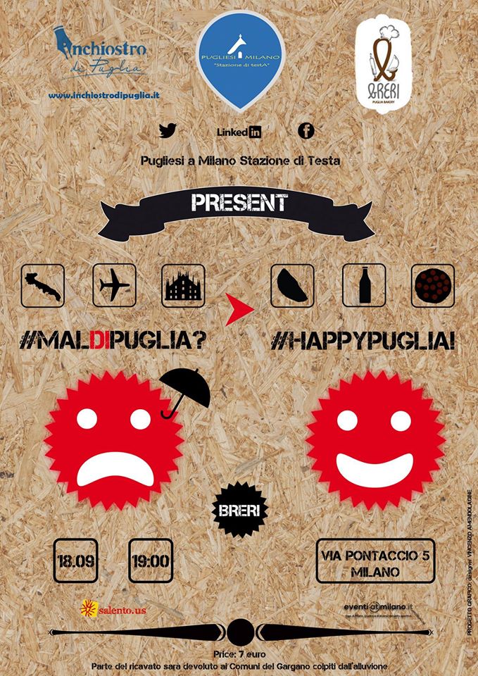 La location scelta per l’evento “Maldipuglia? Happypuglia!” non poteva che essere pugliese: il Breri, ristorante pugliese a Milano, gestito da due giovani imprenditori baresi che hanno deciso di portare nel quartiere degli artisti la focaccia pugliese originale. Qui gli happy hour si fanno a base di riso, patate e cozze e orecchiette alle cime di rapa.