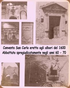 Era, nel 1600, signore di S. Agata il marchese Carlo Loffredo, il quale, per irrobustire la sua nobiltà e le sue finanze, aveva sposato la Contessa di Potenza Eleonora Crispani, donna ricchissima, molto bella e molto pia e caritatevole. La Contessa, con l’ aiuto del Vescovo di Bovino, mons. Tolosa, riuscì ad ottenere dal Papa Paolo V, allora sul soglio di Pietro, il Breve di fondazione, in S. Agata, del convento dei Francescani Riformati. Ottenuto anche il consenso del Padre Generale del Predetto Ordine, padre Giovanni Da Tero, venne dato inizio alla costruzione dell’ edificio, su progetto di ignoto architetto, (forse un monaco), nella spianata di quella gola che, dal lato opposto del paese, mena alla contrada La Liscia. L’ edificio, imponente e severo nelle sue linee architettoniche, venne portato a termine nel 1613. La chiesa venne consacrata nel nome di S. Carlo Borromeo, in onore del marchese di S. Agata Carlo Loffredo, il quale non mancò di assegnare al convento una adeguata elemosina, sufficiente per il mantenimento di 20 frati. Nel 1664, presso il monastero, venne allestita una fabbrica di lana per sopperire alle esigenze della comunità religiosa provinciale e a quelle della locale popolazione. Nel 1870, venne aperta una scuola di filosofia e teologia ove insegnarono valenti docenti, scuola che indubbiamente diede i primi intellettuali di notevole importanza al nostro paese. Fin dai primi del 1800,il convento cominciò il suo ciclo di decadenza, sia per la deficienza delle elemosine, che si erano sempre più assottigliate, sia per le disastrose conseguenze del terremoto del 1851 che rese inutilizzabile l’ ala sinistra del fabbricato. Quando i beni della Chiesa vennero incorporati dallo stato Italiano, la comunità religiosa si sciolse e i monaci si trasferirono altrove. Rimase un sol monaco, frà Giuseppe a sorvegliare affinchè il fabbricato non andasse in rovina. La chiesa di S. Carlo, annessa al convento, è rimasta consacrata fino a pochi anni fa. Chiesa abbastanza grande e spaziosa, che raccoglieva opere d’ arte di notevole valore, come ad esempio un leggio in legno pieghevole lavorato con un solo pezzo di legno pregiato, due altari di granito locale rosso, e due statue di santi. Il sacerdote Lorenzo Agnelli, nella sua cronaca di S. Agata, a proposito di S. Carlo così scrive: “L’ antico fervore cittadino per quel convento non si è spento, e si reclama che torni in onore”. << A niun altro uso sarebbe convertibile e sarebbe imperitura vergogna se l’ edificio cadesse, le rovine ci griderebbero contro e sempre>>. (1). È stato, forse, per non sentire questo sempiterno grido delle rovine, che l’ amministrazione comunale di S. Agata ha ritenuto opportuno di demolire e spazzare dalla faccia della terra i gloriosi avanzi di quello che fu un pregevole edificio del 1600, rimasto, nel piano di S. Carlo a sfidare il tempo, silenzioso e misterioso come tutti i ruderi, ma dignitoso come una vecchia signora decaduta che non dava fastidio a nessuno? (2). I santagatesi, in occasione della festività di S. Pasquale, si recavano nella chiesa di S. Carlo e nello assolato dolce pomeriggio del 17 maggio di ogni anno, molte merende venivano consumate sul piano antistante alla chiesa, da parte di artigiani ed operai che si recavano in gruppi di amici per passare in letizia un pomeriggio di primavera. Tra gli svaghi tradizionali dobbiamo ricordare quello della rottura del tarallo di melazzo con il sedere. Il giorno successivo molte madri e mogli mettevano i calzoni dei figli e dei mariti nella “medicina dei panni”, per far scomparire le difficili macchie di erba. (Allora non esistevano i detersivi biologici!). Ci corre l’ obbligo di ricordare il compianto amico Samuele Danza, allora podestà di S. Agata, che dopo il terremoto del 23-7-’30, rivolse istanza al Genio Civile di Foggia per ottenere fondi per la ricostruzione dell’ edificio cadente. Il nobile tentativo non ebbe favorevole esito, perché i tecnici del predetto ufficio non ritennero applicabile al caso la legge speciale per il risarcimento dei danni ai fabbricati terremotati. Nel 1928 anche l’ allora podestà avv. Donato Barbato tentò di salvare almeno la chiesa facendo costruire a spese del Comune un arco di sostegno della volta. In seguito alla demolizione della chiesa, le pregevoli statue dell’ Immacolata e di S. Francesco vennero trasferite nella chiesa di S. Angelo, ove attualmente si trovano esposte alla devozione dei fedeli. La statua di S. Pasquale venne prima trasferita nella chiesa di S. Antonio e successivamente sistemata nella Cappella della Madonna dell’ Arco. La statua di S. Carlo è attualmente nella chiesa di S. Antonio, mentre quella di S. Giovanni Battista trovasi esposta nella chiesa della Trinità. Oggi, al posto del verde prato del piano di S. Carlo esiste un campo sportivo che non ancora è stato posto in efficienza; il rudere del contento è scomparso come neve al sole, senza lasciare la benché minima traccia; è scomparsa anche l’ antica croce marmorea; di conseguenza è scomparso anche l’ uso della merenda il giorno di S. Pasquale, e la tradizione della rottura del tarallo. Addio monumenti, tradizioni e ricordi di un tempo indubbiamente più felice.