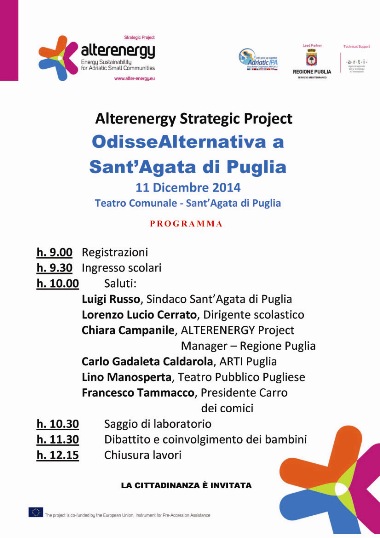Si conclude giovedì 11 dicembre nel Teatro Comunale di Sant’Agata di Puglia (FG), con il saggio di laboratorio tratto da “L’Odissea” di Omero, il percorso teatrale/didattico dedicato ai temi delle energie alternative e del riciclo ambientale, in linea con gli obiettivi del Progetto Strategico “ALTERENERGY” (Energy Sustainability for Adriatic Small Communities), finanziato nell’ambito del Programma Transfrontaliero IPA Adriatico 2007-2013.