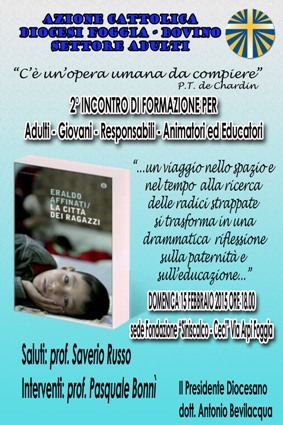 Domenica 15 febbraio 2015, alle ore 18:00, presso la Fondazione Banca del Monte Siniscalco-Ceci, si terrà il secondo incontro formativo rivolto a tutti i soci adulti, ai giovani, agli animatori e agli educatori, di Azione Cattolica. Saranno chiamati a partecipare, dunque, tutti coloro che hanno un impegno educativo all’interno dell’associazione.