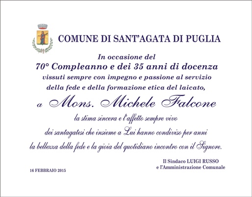In occasione del 70° compleanno e dei 35 anni di docenza vissuti sempre con impegno e passione al servizio della fede e della formazione etica del laicato, a Mons. Michele Falcone la stima sincera e l’affetto sempre vivo dei santagatesi che insieme a Lui hanno condiviso per anni la bellezza della fede e la gioia del quotidiano incontro con il Signore”.