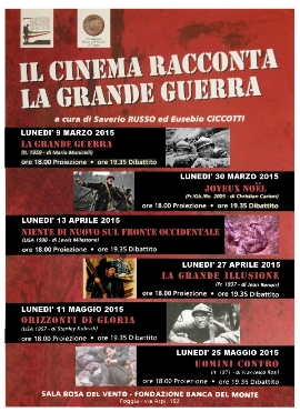 Il ciclo di sei proiezioni è curato dal prof. Eusebio Ciccotti, docente di Storia del Cinema all’Università di Foggia, e da Saverio Russo, presidente della Fondazione e docente di Storia Moderna nell’Ateneo dauno. Una iniziativa legata al “Progetto Memoria” 2015, realizzato dalla Fondazione in collaborazione con la casa editrice Edizioni del Rosone di Foggia e patrocinata dalla Presidenza del Consiglio dei Ministri. che coinvolge alunni ed insegnanti delle classi terze delle scuole secondarie di I grado di Foggia in riflessioni, ricerche e raccolta di materiali sulla guerra del ‘14/’18, con particolare attenzione per i riflessi sul territorio locale.
