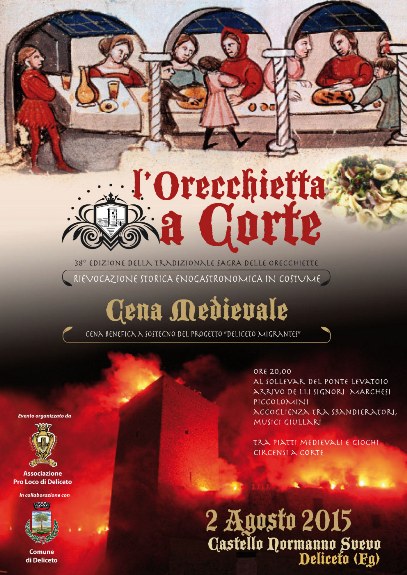 L'unione di questi due eventi hanno dato origine, all'Orecchietta a Corte, rievocazione enogastronomica in costume programmata per domenica 2 agosto prossimo, con una succulenta CENA MEDIEVALE a base, non solo, di orecchiette, ma con la riscoperta di un ricco menù della cucina tradizionale delicetana, accompagnato da un buon calice di vino locale e dai famosi cantucci, importati proprio dalla senese Famiglia Piccolomini.