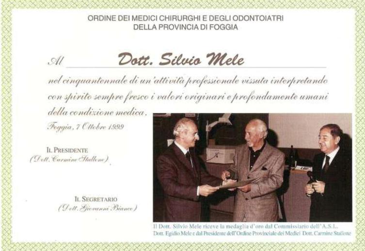 Nel 1999, in occasione del suo 50° anno di attività professionale riceve un riconoscimento dallo stesso Ordine a testimonianza delle sue altissime doti professionali, espletando la sua attività di medico, con serietà ed umana dedizione.