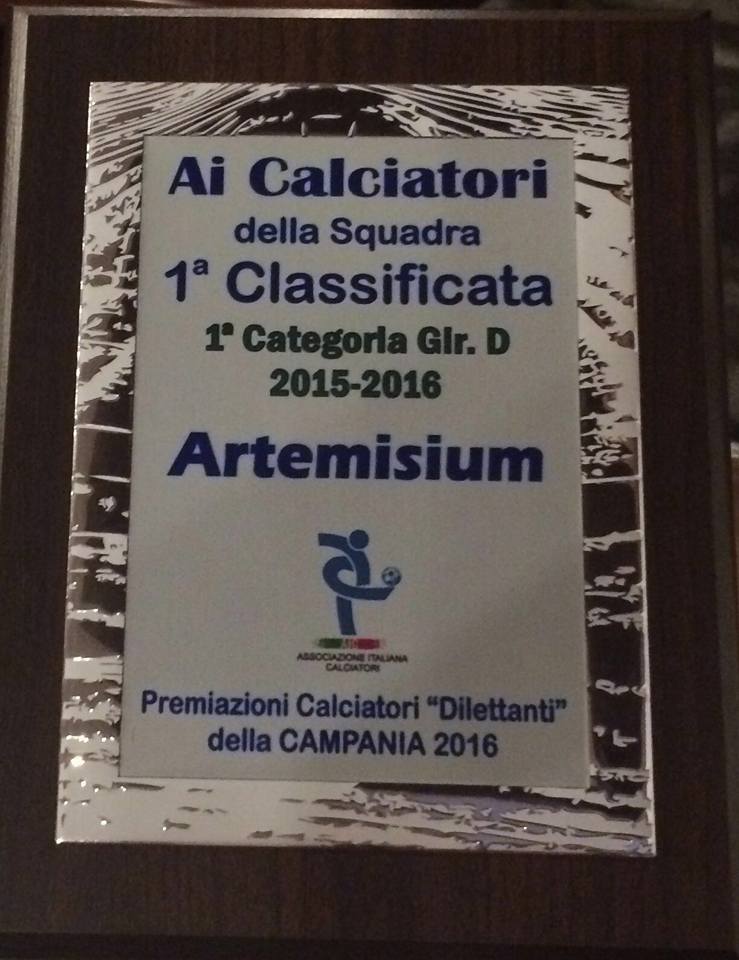 Ieri pomeriggio premiata dalla FIGC Campania presso l'associazione Italiana Calciatori di Nola per la vittoria del campionato di Prima Categoria avvenuto il 22 Maggio scorso. Premiati i giocatori della squadra pugliese con una targa, oltre a loro anche una targa per il mister Mauro Romano, presente alla premiazione il capitano, AntoiAntonio Barbetta. Premiati anche tutti i capocannonieri e i vice-capocannoieri dei vari gironi, tra cui anche Verrilli(Comprensorio Miscano) e Pezzella(Polisportiva Lioni) vincitori dei marcatori del girone dell'Artemisium in questa stagione. Presente alla premiazione il presidente dell'AIC Italiana, Damiano Tommasi.