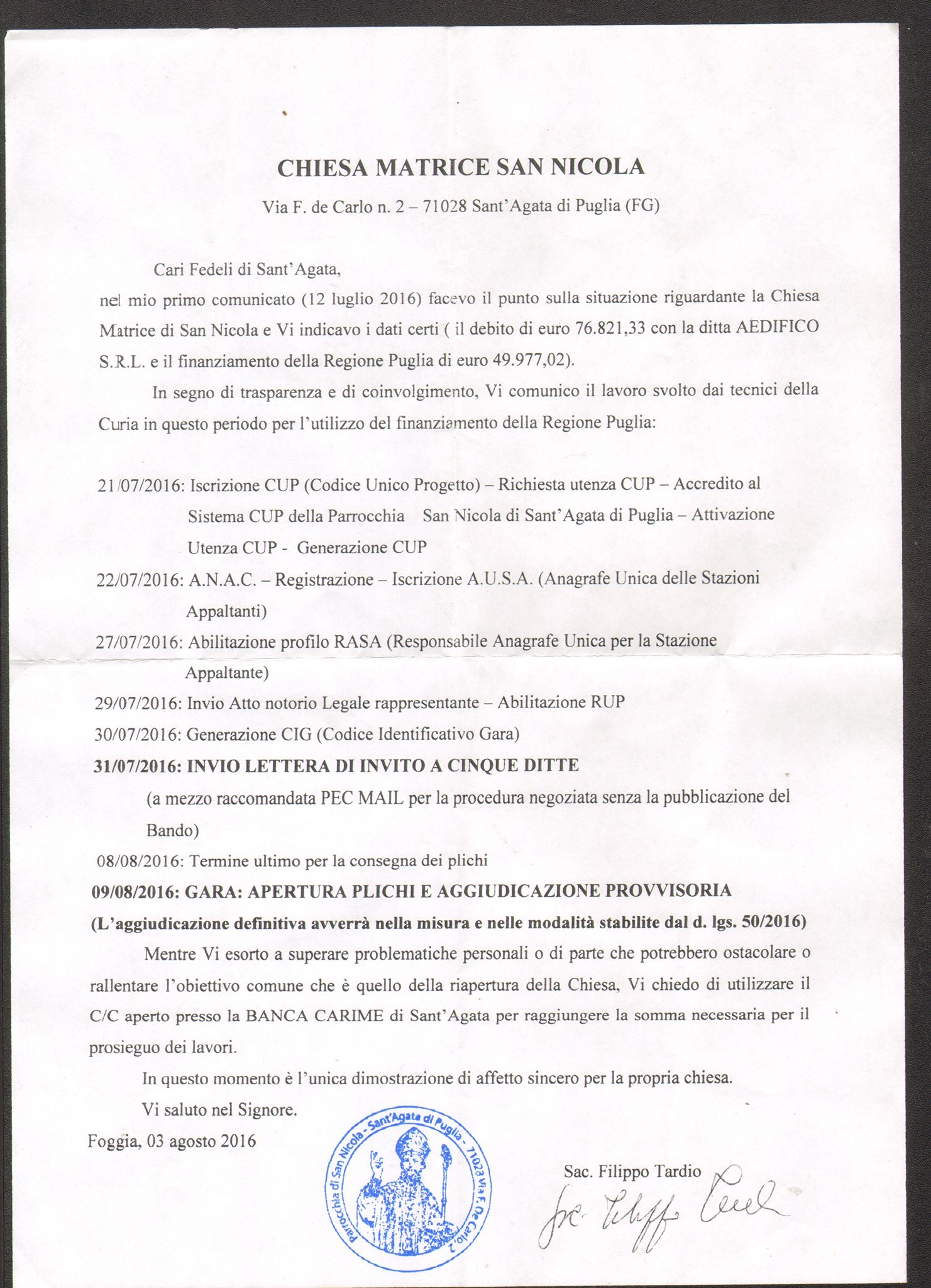 nel mio primo comunicato (12 Luglio 2016) facevo il punto sulla situazione rigurardante la Chiesa Matrice di San Nicola e Vi indicavo i dati certi (il debito di euro 76.821,33 con la ditta AEDIFICO S.R.L. e il finanziamento della Regione Puglia di euro 49.977,02).