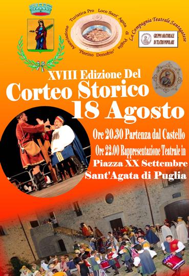 Dopo il grande successo delle precedenti 17 edizioni, torna, a Sant’Agata di Puglia, l’imperdibile appuntamento con lo sfarzoso corteo storico 2016 realizzato dalla Pro Loco “Pierino Donofrio” e dalla Compagnia Teatrale Santagatese, con il contributo dell’Amministrazione Comunale. L’evento si svolgerà il 18 agosto nella suggestiva cornice del centro storico del paese. Una storia a tinte fosche quella del capitano Agatone, Pandolfo IV, principe di Capua e signore di Sant’Agata, personaggio tanto controverso quanto ardimentoso. Le sue vicissitudini, narrate con consumata maestria dall’indimenticabile Sergio Barbato, nell’omonimo testo teatrale rivivono anche quest’anno, in alcune scene salienti, interpretate dagli attori della Compagnia Teatrale Santagatese, a conclusione del corteo storico, nella piazza del paese. Storia misteriosa e affascinante, sospesa tra il comico e il grottesco, capace ogni volta in modo nuovo, di catturare e coinvolgere emotivamente quanti vi partecipano.