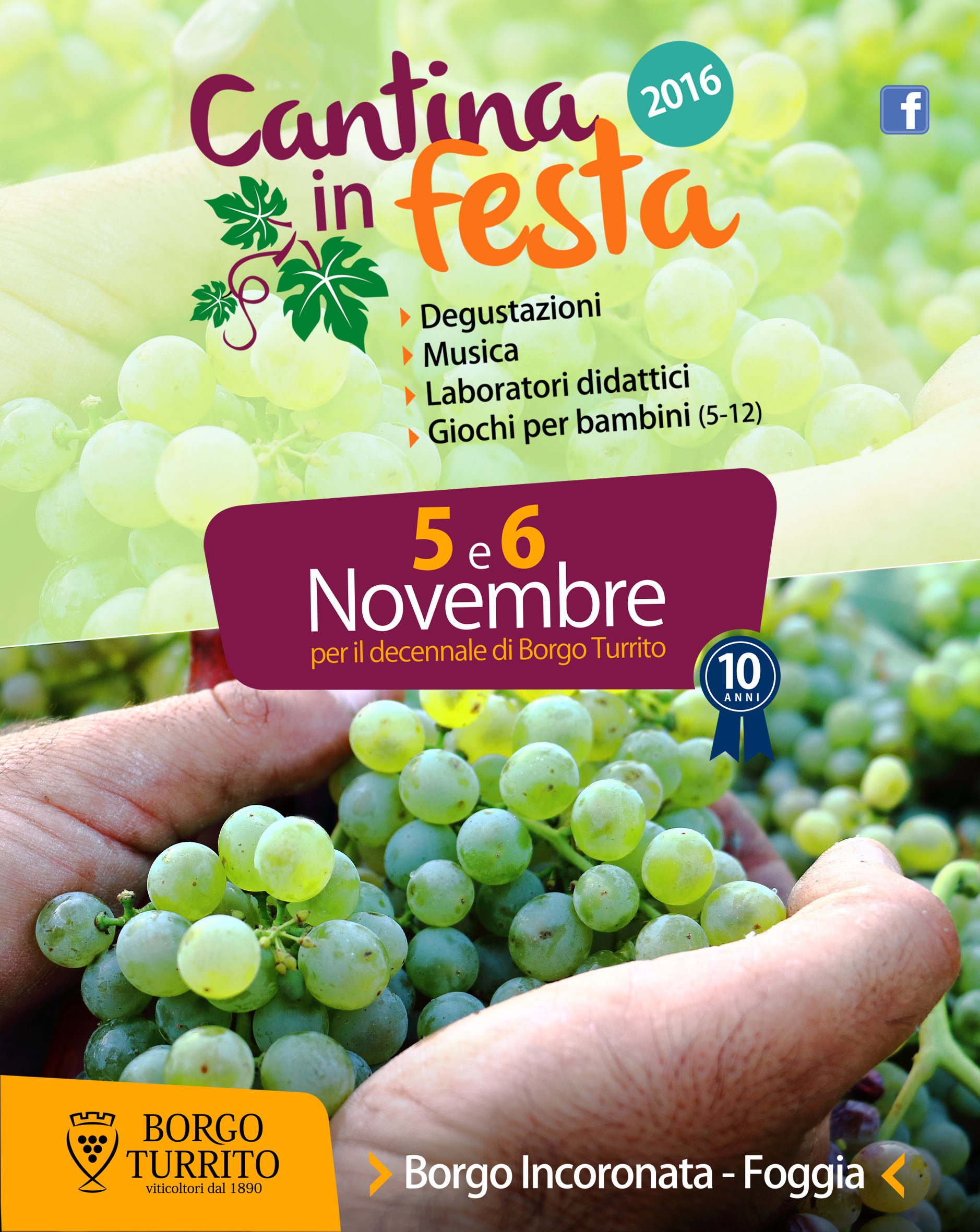 SABATO 5 NOVEMBRE, IL PROGRAMMA. Si comincerà sabato 5 novembre, alle ore 19, con la visita alla Cantina Borgo Turrito. Alle 20, Antonio De Toma presenterà “Cantina in Festa”. Dalle 21, con ingresso libero, lo spettacolo musicale e danzante dei Terraross. Acquistando il ticket da 5 euro, ogni partecipante potrà degustare caldarroste, pizze fritte e vino, avendo in regalo la tracolla e il calice di vetro per assaporare i vini con la guida esperta dell’AIS Foggia.