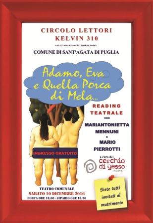 Si terrà sabato, 10 dicembre prossimo, e sarà aperta alla cittadinanza ad ingresso gratuito, la serata che vedrà in scena, alle ore 18,00, presso i locali del teatro comunale, un reading teatrale dal titolo “Adamo, Eva e quella porca di mela”.