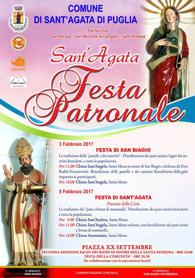 Il 5 febbraio ed il 15 agosto, Sant’Agata di Pugliacelebra una festa in onore di S. Agata, la vergine di Catania che subì il martirio sotto la persecuzione di Decio (252 d.C.) ed il supplizio dell’estirpazione delle mammelle con tenaglie, per volere di Quinziano, governatore della Sicilia. Festa delle donne ed a gestione femminile può definirsi quella del 5 febbraio. Si ritrovano, infatti, le devote senza distinzione di ceto e di età, per onorare S. Agata, patrona del paese, ma prima di tutto loro particolare protettrice, dedicandoLe un culto che per alcuni aspetti richiama quello antichissimo e celebre della Magna Mater, proprio delle genti mediterranee. Per secoli, fino all’inizio dell’800, la festa si svolse nel castello, nella cappella dedicata a S. Agata, a spese del marchese Loffredo. Questi, per la circostanza particolarmente munifico verso il clero secolare e regolare ed i poveri, consentiva al popolo l’accesso per rendere devozione alla Santa. Da quando, nel 1813, fece dono della statua alla chiesa matrice di S. Nicola, gli oneri della festività passarono al popolo, che la celebrò a febbraio con la massima solennità: novena, mattutino (messa alle quattro del mattino), messa solenne, panegirico, processione, vespri, banda e fuochi pirotecnici. Sindaco e consiglieri comunali venivano prelevati a suon di tamburo dalla sede municipale ed accompagnati nella chiesa-madre per assistere col popolo alla messa solenne. Le donne, già dal mattutino, nonostante i rigori del tempo, recavano ciascuna una candela alla Santa. In capaci canestri di vimini, con cura foderati di candide e preziose tovaglie, portavano “re mménne re sand’Aheta” (“minuzzi” a Catania), piccoli pani a forma di seno. Una tacita emulazione le impegnava a dare la forma più graziosa possibile ai pani, spesso piccoli capolavori di arte. Da tenera età ne avevano appreso le modalità di preparazione, che animava case e forni nei giorni precedenti la festa. I canestri venivano deposti ai piedi della Santa, la cui statua, solennemente addobbata ed illuminata, era collocata presso l’altare maggiore. Il rito della benedizione seguiva la celebrazione della S. Messa. Benedetti, i pani erano distribuiti e consumati con gran devozione, dopo aver recitato una preghiera. Se ne conservava sempre qualcuno in casa e per chi era lontano. S. Agata protegge tutte le donne dalle malattie del seno e dà latte abbondante alle nutrici. Qualcosa di intimo e specificatamente femminile esalta la sacralità di questa festa che, come nella tradizione greco-orientale, dà ampio spazio al ruolo della donna e traduce in termini simbolici il culto per la fecondità. Un’altra festa si dedica a S. Agata, associata a S. Rocco e S. Lorenzo, il 15 agosto. E’ la grande festa dell’estate che vede riuniti popolo, autorità civili e religiose, emigranti ritornati dai luoghi di lavoro. Il Comune di Sant’Agata ha sempre tenuto in grande considerazione la Santa patrona, la cui immagine era nel timbro comunale fino alla metà dell’800 ed è nello stemma e nel gonfalone cittadino. Una devozione, quella per S. Agata, nella quale emerge la valenza di certe domande sociali che prevedono un ruolo ed una valorizzazione della donna ed esprimono l’eterno ed inesauribile bisogno della presenza femminile, certezza di continuità della vita, sorgente alimentatrice della vita stessa. Per dare degni onori alla Santa numerose santagatesi hanno costituito un Comitato. Dora Donofrio Del Vecchio