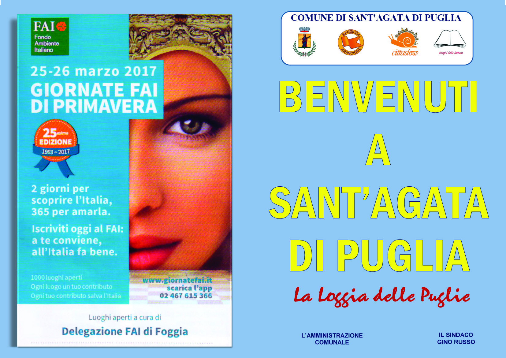 A rendere possibile e realizzabile l’importante e valida iniziativa che coinvolge il caratteristico borgo della provincia di Foggia, ha contribuito in maniera fondamentale l’impegno attivo della delegazione foggiana del FAI, la premurosa disponibilità del Comune di Sant’Agata di Puglia, in modo particolare del Sindaco Gino Russo, sempre sensibile a iniziative volte alla promozione turistica della sua terra, e la collaborazione attiva e fattiva delle varie associazioni locali di volontariato che ancora una volta hanno risposto compatte all’appello del loro paese.