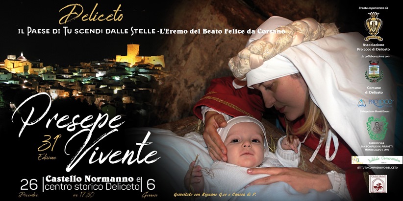 Il 26 dicembre e il 6 gennaio, dalle ore 17,30 alle 21,00, Deliceto, ridente cittadina sulle propaggini del Preappennino Dauno, ritorna protagonista, con l’evento natalizio per eccellenza: Il Presepe Vivente, giunto alla 31° edizione, una manifestazione tra le più longevi della regione. Organizzata dall’Associazione Turistica Pro Loco “A. Iossa”, con il patrocinio del Comune di Deliceto e per la prima volta, con la collaborazione della parrocchia San Pompilio Maria Pirrotti di Montecalvo Irpino, in provincia di Avellino, la cui frazione, “Corsano”, dette i natali al “Beato Felice”. Il monaco agostiniano, che agli inizi del ’500, costruì il Convento, con la chiesa, a pochi chilometri dal paese, che dedicò a Santa Maria della Consolazione, collocandovi una bella immagine di Maria S.S. con il Bambino Gesù in braccio, tutt’ora gelosamente custodita. In questo luogo si formò la Riforma chiamata Riforma delicetana.