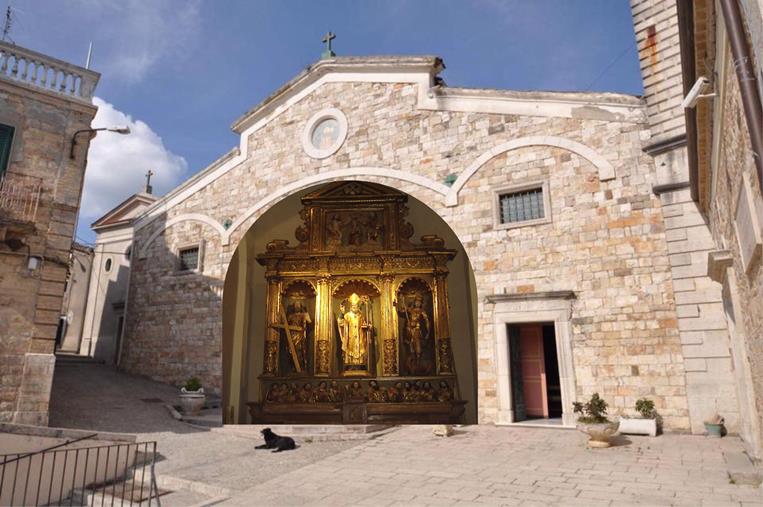 Le tre nicchie sono marcate lateralmente da 4 colonne corinzie. che inferiormente sono intagliate da foglie d'acanto e busti di cherubini. Gli stessi motivi decorativi si ripetono sull'architrave della struttura contenente il trittico. Il fregio è collocato sulla nicchia centrale della struttura. esso è occupato da un pannello che reca scolpita a bassorilievo l'Incoronazíone della Vergine da parte di Cristo (lato sinistro) e di Dio (lato destro). Nel frontone marcato da una semplice cornice è raffigurato lo Spirito Santo sotto forma di colomba. Il trittico è stato restaurato negli anni 1983 84. Esso localmente è detto "Trittico delle parrocchie" poichè rappresenta i tre Santi (S.Andrea, S.Michele e S.Nicola) cui sono dedicate in S.Agata di Puglia le parrocchie omonime.
