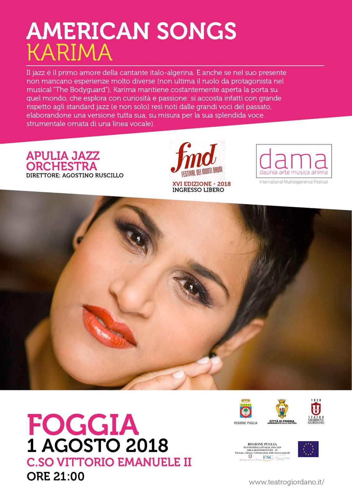 Mercoledì 1 Agosto, infatti, alle ore 21, sarà il palco foggiano di via Lanza ad accogliere la cantante italo-algerina Karima e la Apulia Jazz Orchestra, compagine nata proprio all'interno del Festival che realizzeranno uno spettacolo dedicato agli standard più amati della canzone statunitense.