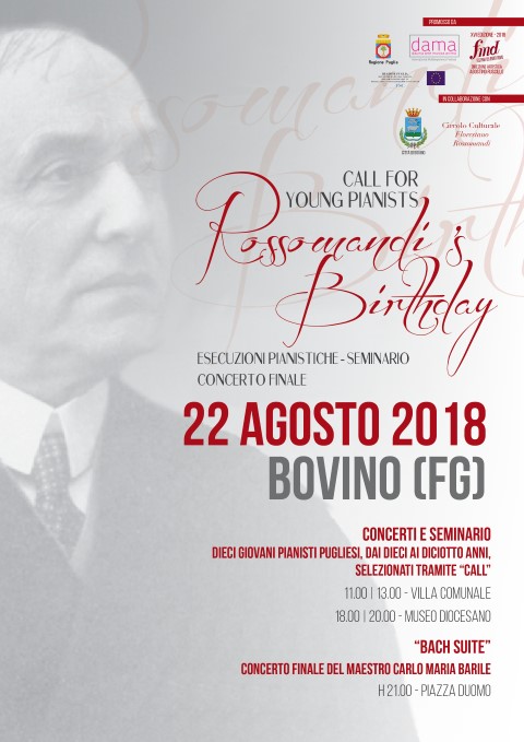 Il Festival, quindi, resta a Bovino anche mercoledì 22 agosto per il 'Rossomandi's Birthday': dieci giovani pianisti pugliesi under 18, selezionati tramite una “call” possono visitare Bovino, gustare ottimo cibo genuino e contestualmente svolgere un incontro seminariale.