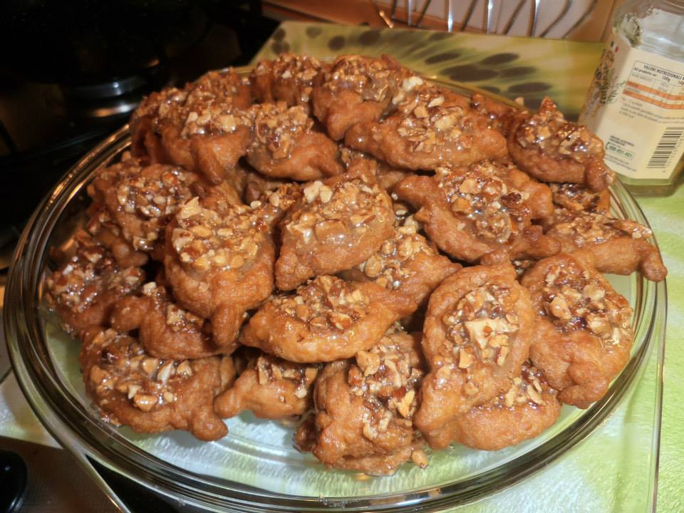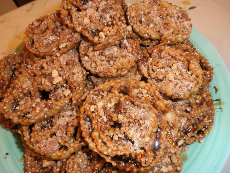 Tritare le mandorle abbrustolite insieme alle noci, con il dorso di una bottiglia. Versarle in una ciotola, aggiungere lo zucchero e le cortecce di mandarino tritate. Calare il tutto nel miele caldo che è stato messo precedentemente a riscaldare sul fuoco a fiamma bassa, condire le crespelle e disporle su spelonche grandi o vassoi.