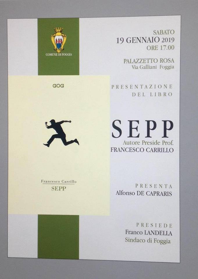 Come da programma, sabato 19 gennaio 2019, nella Sala Rosa del Palazzetto dell’Arte di Foggia si è svolta, a cura del Comune di Foggia, la cerimonia di presentazione del libro a firma del preside Francesco Carrillo intitolato “SEPP”.