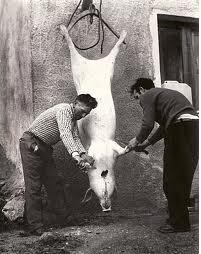Questo perché, “pe bberé chi ère stète chiù bràve a ffè crésce re cchiù lu purciérre, s’ausèva mesurè cu re ddésceta (21) re la mèna quande ère làrehe (22) ru llàrde (23) ca stéva nd’à la shchéna re lu de cuius, róppe ca lu cuórpe, appìse cu lu hammariérre (24) a lu cateniérre (25)sótte a la làmbija (26), menéva squartète e fatte rinde a dòje parte, ca tutte quande putévne scì a gguardè e rrè nu ggiurìzie”, quasi mai, per invidia, positivo, oppure, per indolenza, non espresso, “ma però, cùme rice lu pruvèrbie, quanne la hàtta nu ng’arrìva, rice ca ru llarde éja r’aràngete” (27).