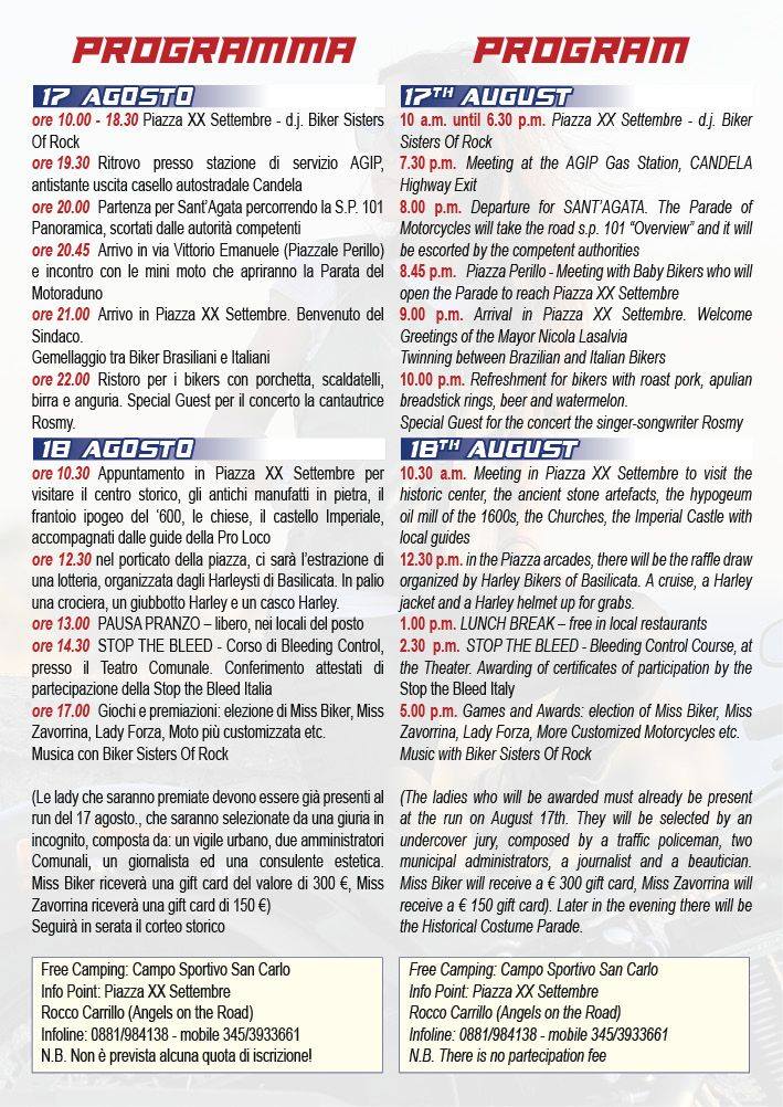 Si parte sabato 17 agosto dal ritrovo presso il casello autostradale di Candela, alle 20 si parte per Sant'Agata, percorrendo la provinciale 101 panoramica, per arrivare in paese, dove si svolgerà l'incontro con le mini moto che apriranno la parata del motoraduno. A seguire, tutti in Piazza XX Settembre per il benvenuto del Sindaco e il gemellaggio tra biker brasiliani e italiani, all'insegna della festa, della gastronomia locale e della musica con special guest la cantautrice Rosmy.