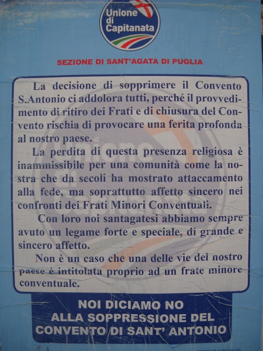 Veramente bello il Telegramma che ha inviato il Sindaco al Santo Padre Benedetto XVI... Speriamo che ci possa aiutare per scongiurare questa "DISGRAZIA" che incombe sia sulle sorti del Convento di Sant'Antonio che sul Paese il quale non può rimanere senza una Guida Spirituale....