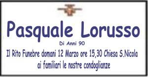 Serenamente è venuto a mancare all'età di anni 90 Pasquale Lorusso il rito funebre domani 12 Marzo 2012 ore 15,30 Chiesa S.Nicola ai familiari le nostre condoglianze