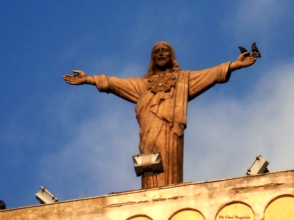 Ieri sera alle 17,00 ha iniziato a fare più freddo del solito e scendendo verso il ponte, per andare a buttare la mia raccolta differenziata, mi sono fermato con un signore anziano per dirgli di rimanere in casa perché c’èra la voria(il vento freddo). Lui mi risponde:”Figlio mio, questa eja la traversa, che è meno fredda della voria”! Spiegazione che molti giovani non sanno. Stamattina invece l’aria è meno fredda. Oggi è domenica e la scelta della chiesa, dove ascoltare la messa, si riduce, perché la Trinità alla Portanova, se non è tornata la corrente, non apre. Il Convento di S. Antonio è in fase di chiusura; ma non disperate, ci restano ancora le altre, tra cui la grande Chiesa Madre di S. Nicola. Credo che la fede vada oltre ogni cosa e la presenza di Dio c’è, ovunque. Ci vuole solo un buon prete e la messa può essere fatta in campagna, in piazza, in qualsiasi luogo, come insegnava S. Francesco. La foto di oggi è questa: Gesù che abbraccia tutti dalla terrazza del nostro Ospizio; alle sue spalle il cielo azzurro e davanti a lui le nostre case, le nostre famiglie, il paese, tutto il mondo.