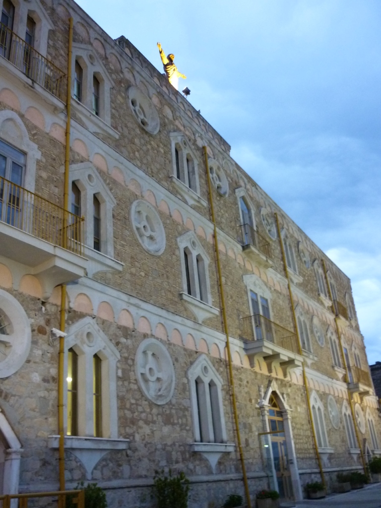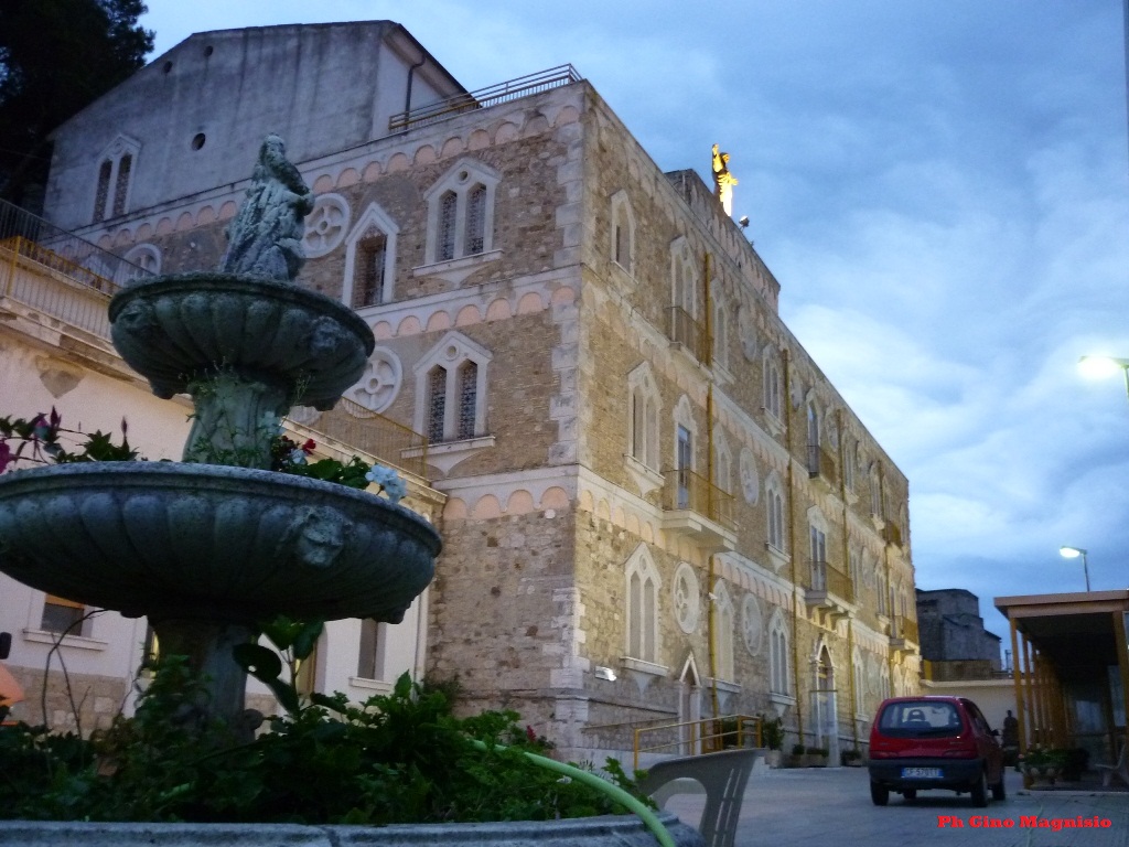 Buongiorno. Scusate il ritardo Amici, ma sono tornato adesso, dopo un giro per il paese a cercare la foto giusta x voi. L’aria si è rinfrescata di parecchio e i gradi si sono abbassati. Durante il giro in macchina per il paese, appena fatto giorno, alle ore 6,30, notavo la statua di Gesù in alto, sopra il tetto dell’Ospizio ancora illuminata…bella e imponente. Così sono andato più vicino per scattare la foto che ritraesse l’entrata e la struttura della CASA DEL SACRO CUORE. Tante cose sono state dette su questa opera e sulle sue attività, quindi non vi voglio annoiare. La mia foto onora e rispetta.