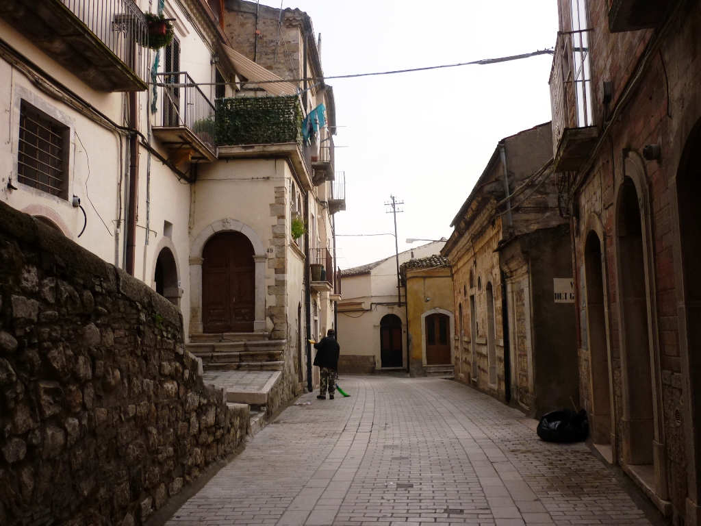 stamattina mi sono spostato tra la piazza e il Perillo. L’odore del pane caldo di ieri mattina e quello di oggi mi ha invitato spudoratamente ad entrare nel forno e comprare un pezzo di pizza rossa, la nostra vecchia “pizza cu ruoglie”. Come facevo da bambino, l’ho mangiata per strada, camminando fino alla piazza, e così…strada facendo…ho scorto questo momento particolare, nella stradina dove tutte le mattine incontro il nostro vecchio spazzino e non operatore ecologico, a noi ci piace chiamarlo ancora così, come un ricordo della nostra memoria e senza offesa alcuna. Stamattina c’è più movimento in giro e qualcuno ha detto: