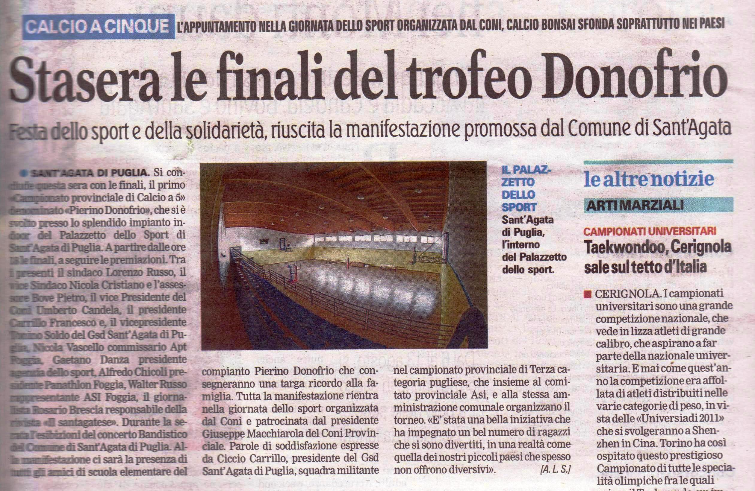 DURANTE IL TORNEO “PIERINO DONOFRIO” DI CALCIO A5, SVOLTO PRESSO IL PALAZZETTO DELLO SPORT DI SANT’AGATA DI PUGLIA, LA GAZZETTA DEL MEZZOGIORNO, HA PUBBLICATO PIU’ DI UN ARTICOLO NEGLI ULTIMI DUE MESI. LE PAROLE DEL GIORNALISTA SONO STATE POSITIVE E CREDO SIA GIUSTO METTERE AL CORRENTE I SANTAGATESI LOCALI E NEL MONDO DI QUESTE INIZIATIVE. NELLA EDIZIONE DEL 4 GIUGNO, GIORNATA DELLA FINALE DEL TORNEO, A PAGINA XVII DI FOGGIA SPORT, RIPORTAVA IL SEGUENTE ARTICOLO: