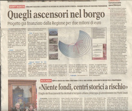 Ascensori panoramici a Sant’Agata di Puglia? Scusate, ma questa è una notizia troppo ghiotta per noi santagatesi “ a distanza”. Non potete tenerla tutta per voi. Penso che sarebbe proprio il caso di illustrarci più a fondo il progetto, pubblicando anche il plastico, se esiste, e farci sapere dove saranno ubicati questi tre ascensori.Saranno troppo visibili? Cosa ne pensano i santagatesi residenti? Personalmente sarei favorevole, basta che non deturpino il nostro bel panorama. Un saluto a tutti.