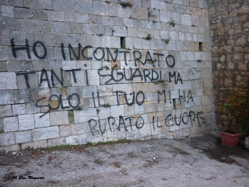 Meno male che c’è ancora chi parla d’amore, o meglio…scrive d’amore, sui muri. Non ha importanza chi l’abbia fatto ma di certo fa un bell’effetto e di questi tempi, il sentimento verace e spavaldo, è raro. La frase, per molti di voi, sarà già conosciuta ma spicca bene scritta lì, ai quattro venti, all’aria aperta, in una strada di passaggio dove molti possono leggerla.