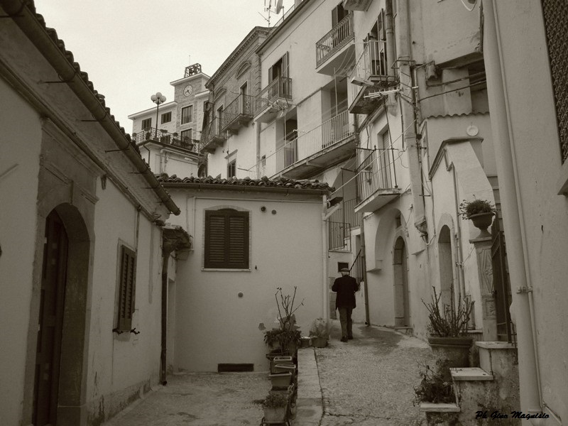 Il municipio che si nota in alto ne è la prova. Il vecchietto che s’incammina in quella strada e i toni chiaro-scuro dell’immagine donano un tocco di nostalgia.