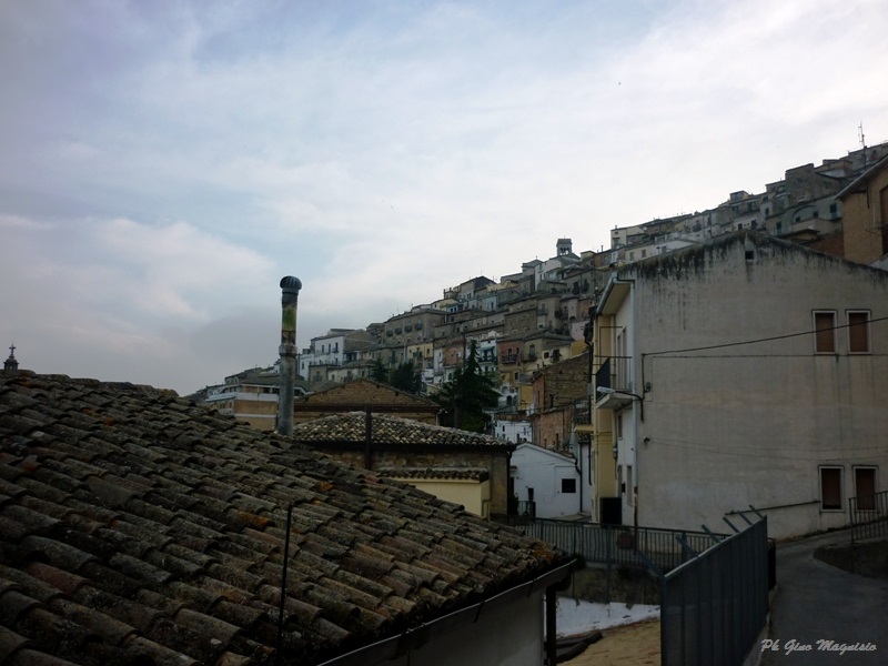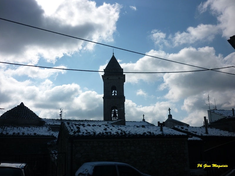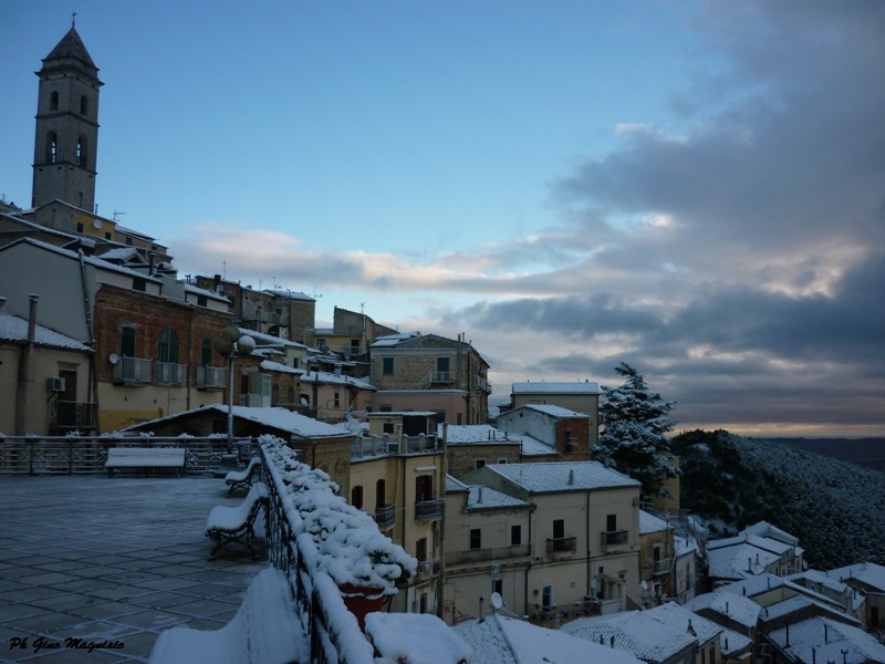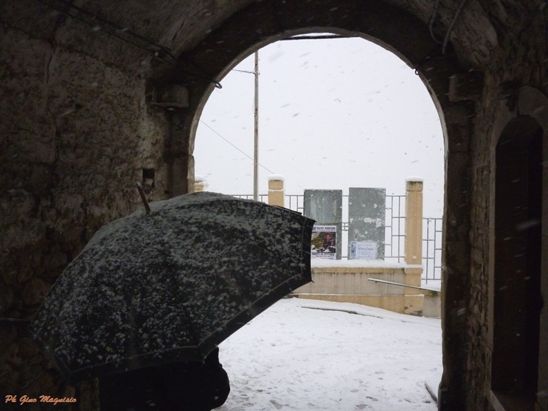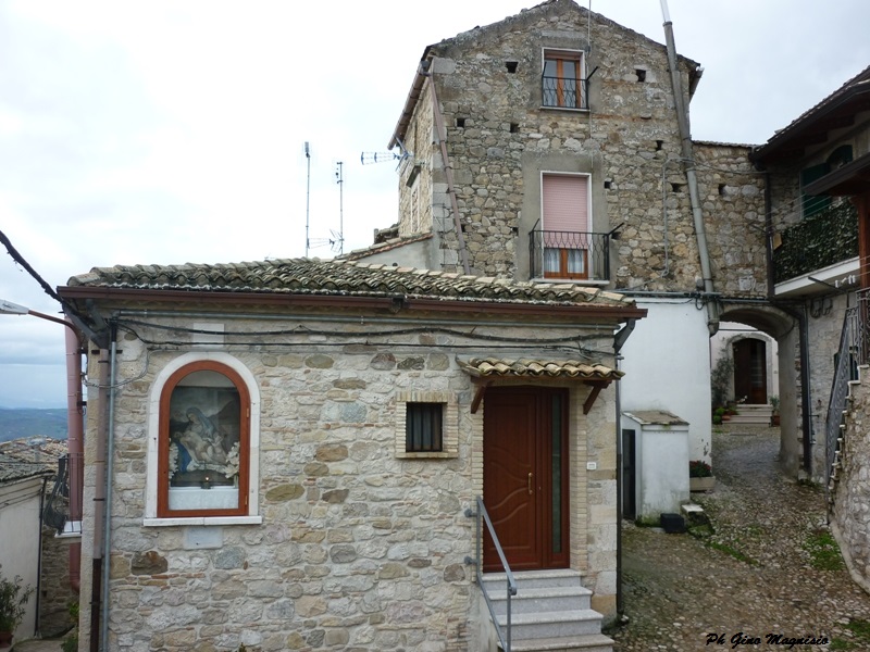 Passato il gelo della neve rimane il freddo. Una manciata di neve è rimasta sui tetti. Qualche cane randagio che si trascina per le strade bagnate e poca gente in giro, è l’atmosfera di una stagione solitaria e triste che durerà poco, perché presto le luci natalizie dei negozi e dei balconi, porteranno allegria a grandi e piccini. Il cortile nella foto è conosciuto a molti di voi: piazzale Chiancato- antico Comune del paese, bella la nicchia con la Madonna dell’Aiuto.