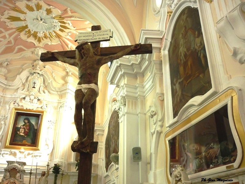 Siamo abituati a vedere il Cristo quasi sempre allo stesso modo, stesso viso e capo chino sulla croce, ma il volto è quasi sempre lo stesso. Quello che vediamo in foto mi ha colpito perché diverso dal solito. Si trova nella chiesa del Santuario della Consolazione, a Deliceto, meta annuale di noi Santagatesi. Il volto è molto sofferente e sembra avvicinarsi di più a un vero volto umano. Anche i capelli sono diversi. Per un vero cattolico non cambia molto. Ognuno crede a modo suo. Ognuno prega come vuole. Ma la fede è unica, come Dio.