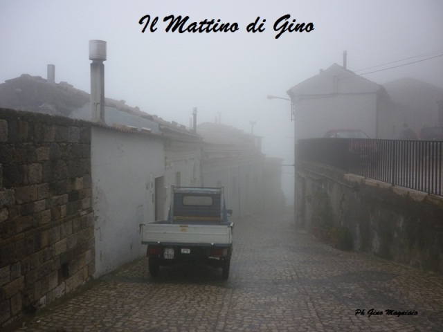 Stamattina, appena alzato, guardo fuori e vedo la stessa nebbia di ieri e sento la forte umidità. Alle 5.30, la temperatura è di 11° - Non sento neanche l’abbaiare di un cane. Strade bagnate e una leggera pioggia continua a cadere sul nostro paese. Eppure, quando più tardi, con un po’ di luce in più, ti affacci dal belvedere della piazza, scorgi il fascino particolare delle case avvolte da nuvole di nebbia e nelle vallate sembra di vedere enormi batuffoli di ovatta che circondano la nostra montagna. Sembra di essere in cielo, tra le nuvole. In effetti, per me il paese, è il mio paradiso.